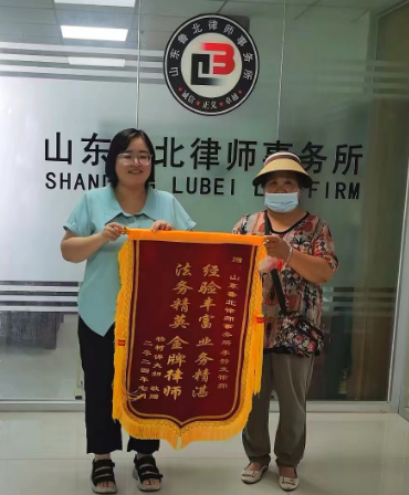 2024年7月4日,委托人杨某某将写有“经验丰富、业务精湛、法务精英、金牌律师”的锦旗送到山东鲁北律师事务所,向我所李静文律师赠送锦旗,感谢李律师在为其代理的案件中尽心竭力、尽职尽责,并对鲁北律师的专业水平表示认可和赞扬。