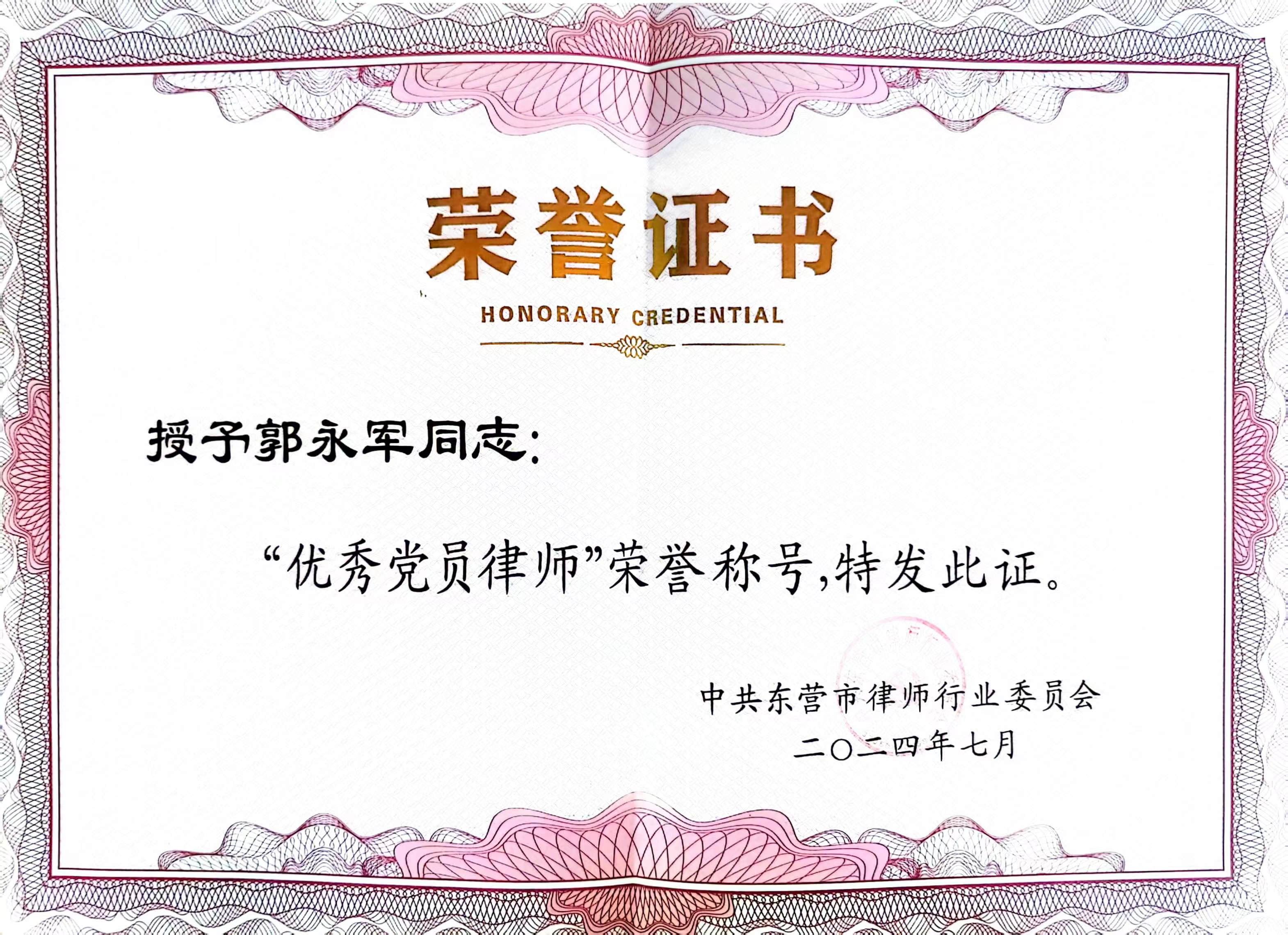 近日,为庆祝建党103周年,激励和动员全市律师行业基层党组织和广大党员律师在新时代新征程上踔厉奋发、勇毅前行,经东营市律师行业党委研究、东营市司法局党组同意,对10个先进基层党组织、20名优秀党员律师及10名优秀党务工作者予以通报表扬。山东鲁北律师事务所党支部被评为“先进基层党组织”,支部党员郭永军被评为“优秀党员律师”。