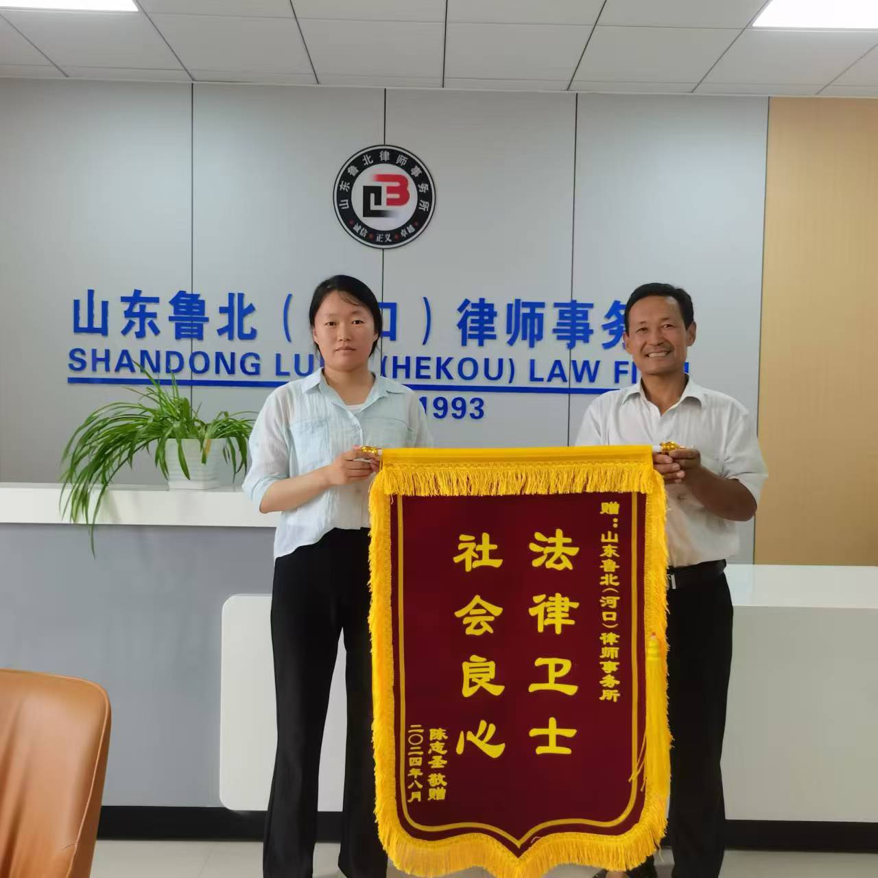 2024 年 8 月 9日,对于山东鲁北(河口)律师事务所来说,是一个充满荣耀与感动的日子。当事人满怀感激之情,将一面绣有“法律卫士,社会良心”的锦旗送到了山东鲁北(河口)律师事务所,以表达对孙冬梅律师专业素养的认可,及对山东鲁北(河口)律师事务所的深深敬意。