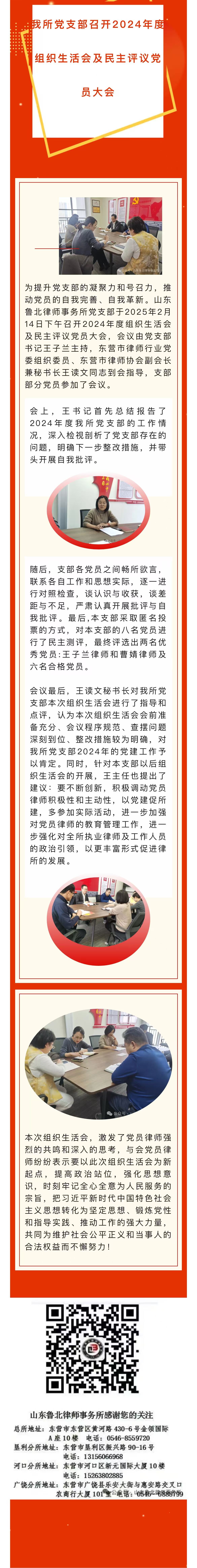 为提升党支部的凝聚力和号召力,推动党员的自我完善、自我革新。山东鲁北律师事务所党支部于2025年2月14日下午召开2024年度组织生活会及民主评议党员大会,会议由党支部书记王子兰主持,东营市律师行业党委组织委员、东营市律师协会副会长兼秘书长王读文同志到会指导,支部部分党员参加了会议。