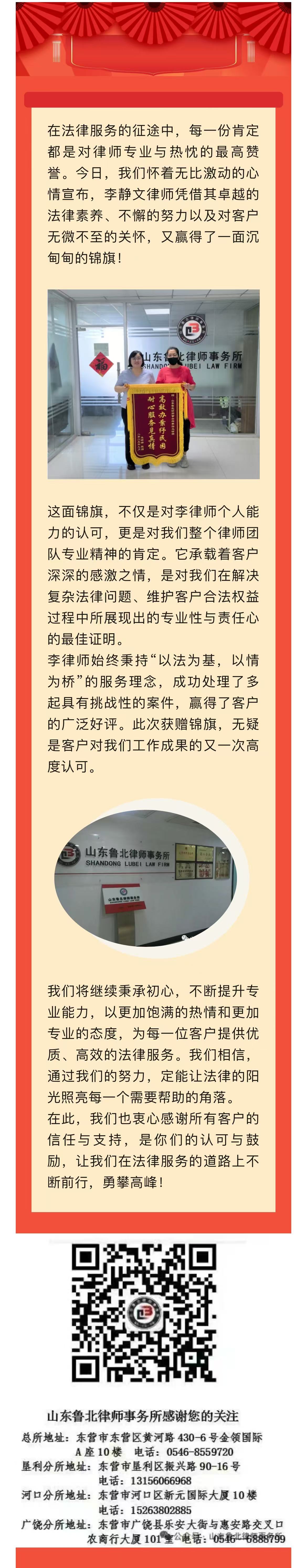 在法律服务的征途中,每一份肯定都是对律师专业与热忱的最高赞誉。今日,我们怀着无比激动的心情宣布,李静文律师凭借其卓越的法律素养、不懈的努力以及对客户无微不至的关怀,又赢得了一面沉甸甸的锦旗!