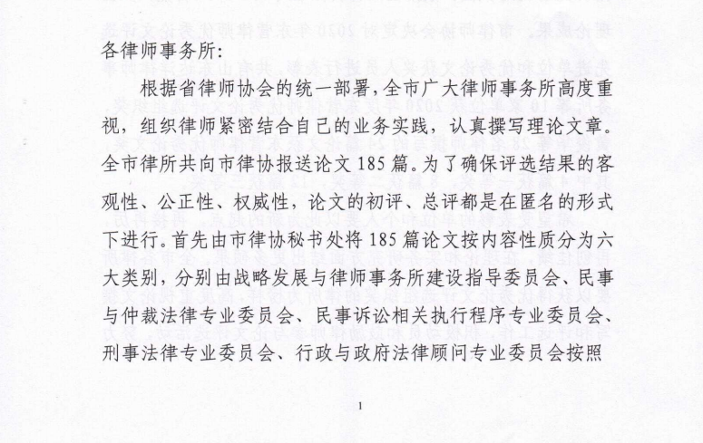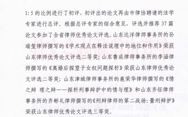 山东省、东营市律师协会2020年开展了律师优秀论文评选活动,2020年12月25日结果公示,全市律所组织律师结合自己的业务实践,认真撰写理论文章,共征集论文185篇。其中评选出2020年东营律师优秀论文评选组织奖律师所10家,优秀论文个人一等奖4篇、二等奖8篇、三等奖12篇。山东鲁北律师事务所在本次评选活动中荣获优秀论文组织奖,及我所林佳怡律师荣获个人一等奖,仝世涛律师荣获个人三等奖。