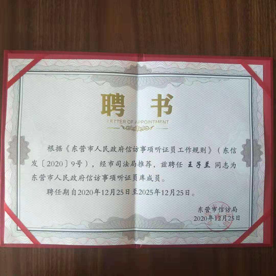 2020年7月份,根据东营市司法局下发文件《调整东营市人民政府信访事项听证员专家库》通知,要求各律所推荐听证人员必须遵守宪法和法律,拥护党的路线、方针和政策,具有良好的政治、业务素质、执业操守和道德修养;且要求听证人员具有基层工作经验,熟悉社情民意,热心社会公益事业,具有吃苦耐劳、乐于奉献的精神。鲁北所经过严格筛选,推荐王子兰律师受聘“东营市人民政府信访事项听证员库成员”。