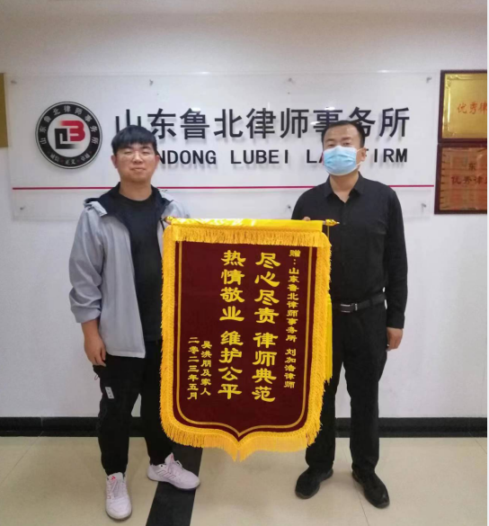 2023年5月11日,山东鲁北律师事务所的刘加浩律师接到了当事人吴某某送来的锦旗,“尽心尽责、热情敬业、维护公平”诚挚反映了山东鲁北律师事务所律师竭诚为当事人服务的理念,将鲁北所律师始终将当事人的权益放在第一位、放在心头体现的淋漓尽致。