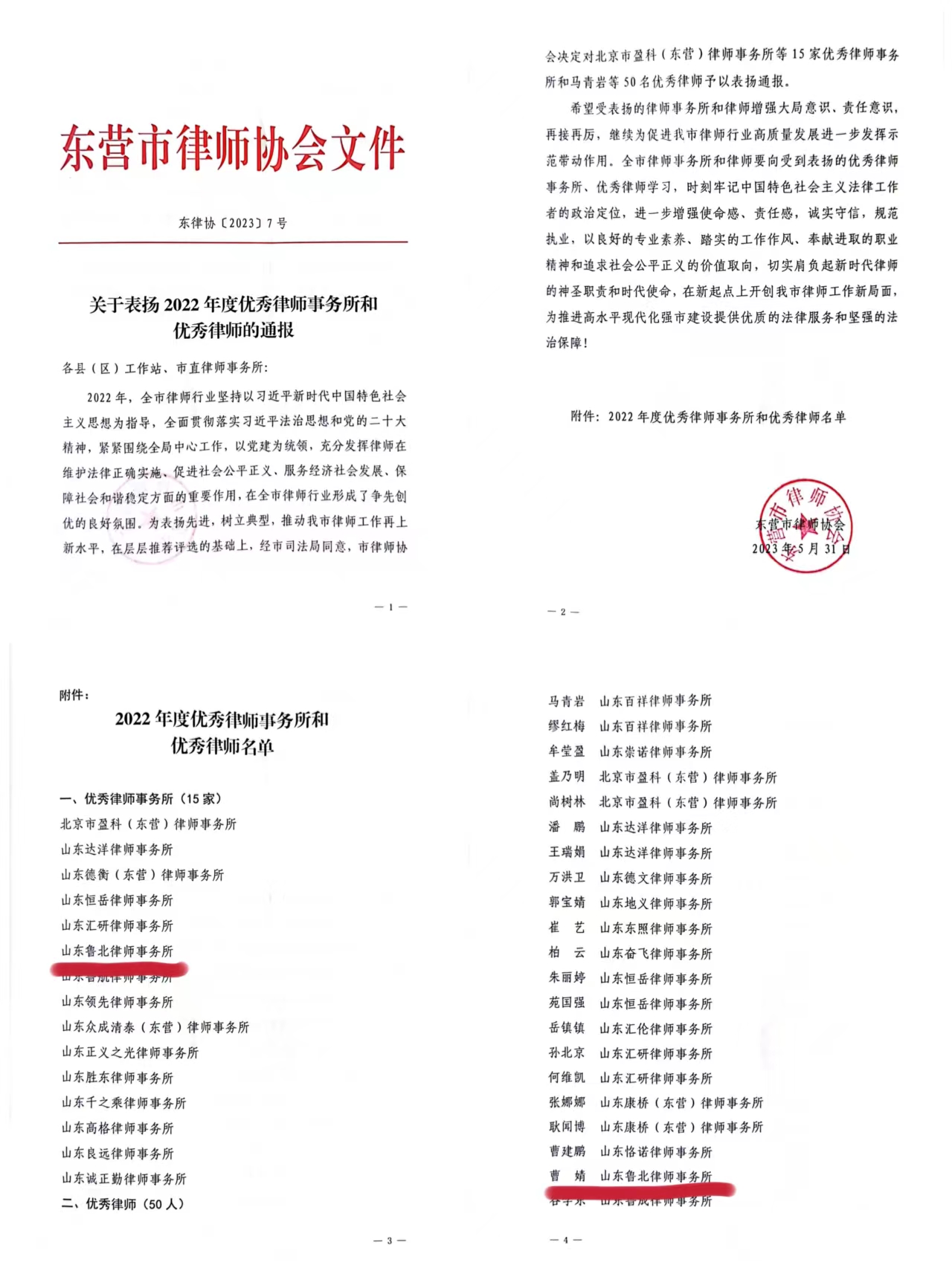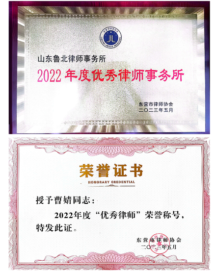为表彰先进,树立典型,推动我市律师队伍建设,近期东营市律师协会开展了2022年度“优秀律师事务所”和“优秀律师”评选表彰工作。经过严格的评选程序,山东鲁北律师事务所荣获“2022年度优秀律师事务所”荣誉称号,同时我所曹婧律师荣获“2022年度优秀律师”荣誉称号。